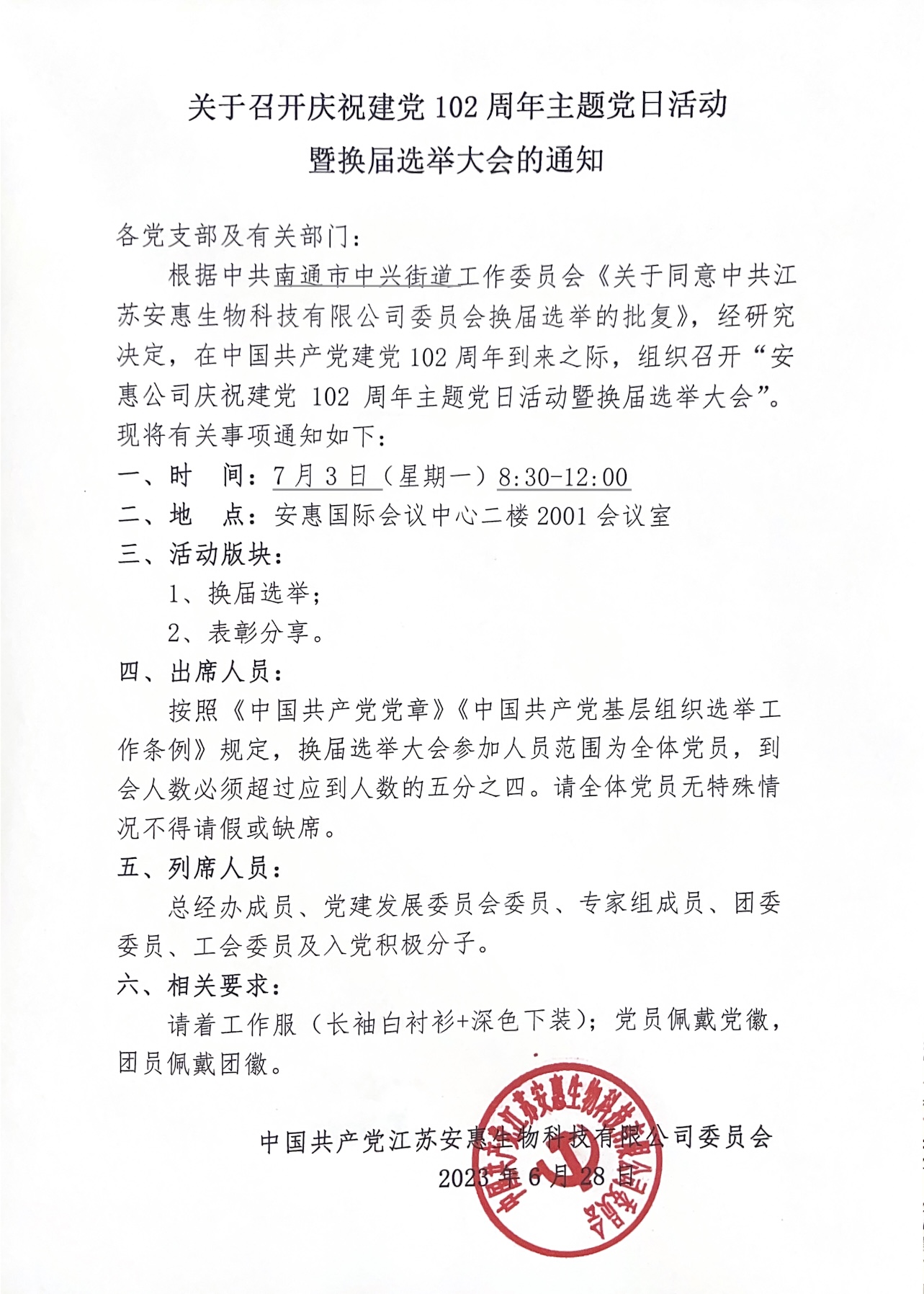 關于召開慶祝建黨102周年主題黨日活動暨換屆選舉大會的通知