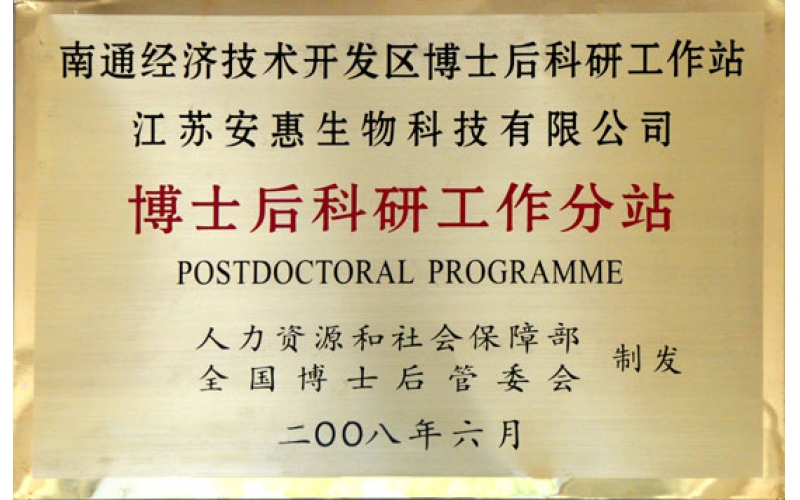 2008年10月15日,安惠公司接受國家人力資源部、社會保障局、全國博士后管委會聯合制發的“博士后科研工作分站”銅牌。